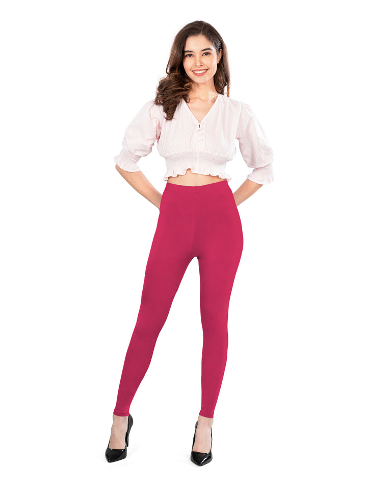 These Dark Rani Cotton Spandex Ankle Length Leggings combine comfort and flexibility with their 4-way stretch fabric, ensuring unrestricted movement during any activity. Designed with a flat waistband for a sleek fit, they provide excellent support without digging in. Perfect for daily wear or workouts, they offer durability and a flattering silhouette.