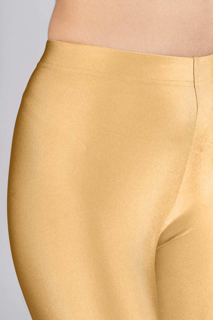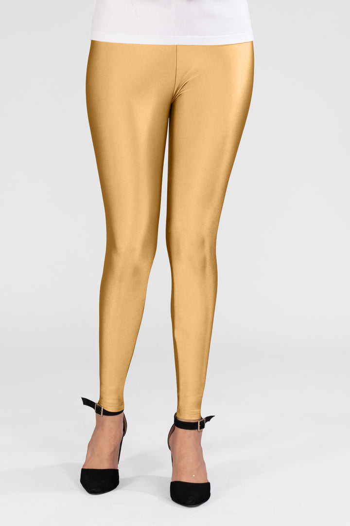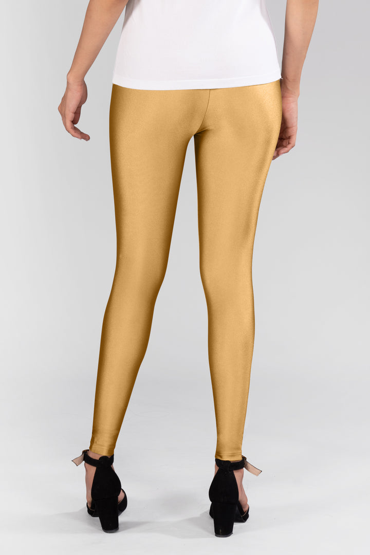 These Gold Shimmer Ankle Length Leggings are crafted from nylon shimmer fabric, offering a sleek and radiant finish. Designed to sit comfortably at the ankle, they provide a flattering fit that pairs effortlessly with a variety of outfits. Ideal for occasions that demand a touch of elegance, these leggings combine style and comfort with a subtle metallic sheen.